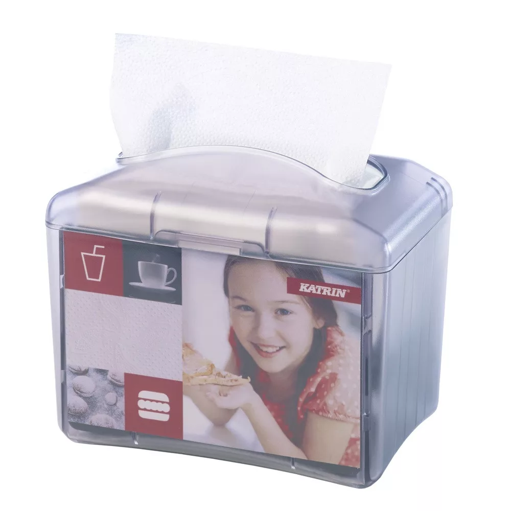A Katrin asztali szalvéta adagoló kompakt megoldás a higiénikus szalvéta adagolására gyors tempójú éttermi környezetekben, mint például ebédéterek, svédasztali sorok és önkiszolgáló pultok. Tartós, sötétszürke ABS műanyagból készült, és egyesével adja ki a friss ebédsalvétákat – csökkentve a hulladékot és javítva a higiéniát. Könnyű újratölteni és karbantartani, praktikus választás menzánkhoz, catering-ellátókhoz és laza éttermekhez.