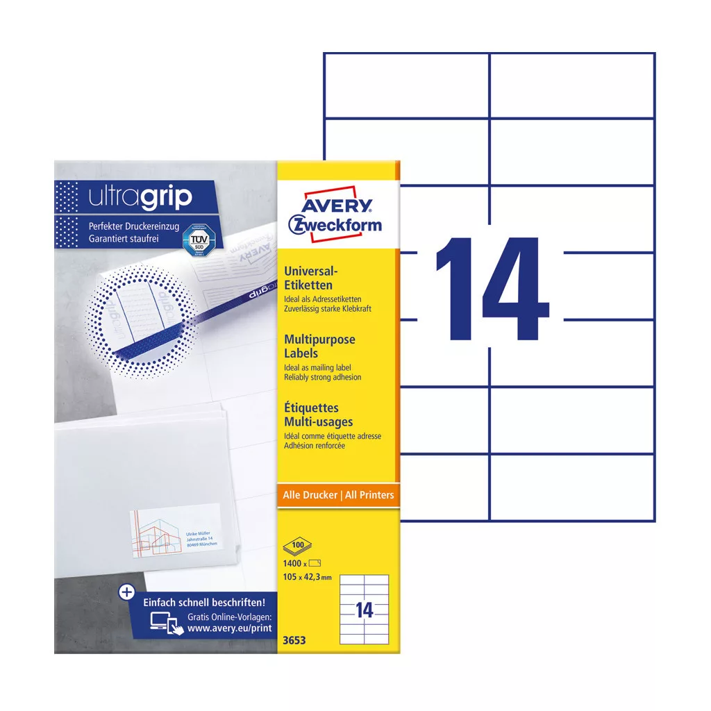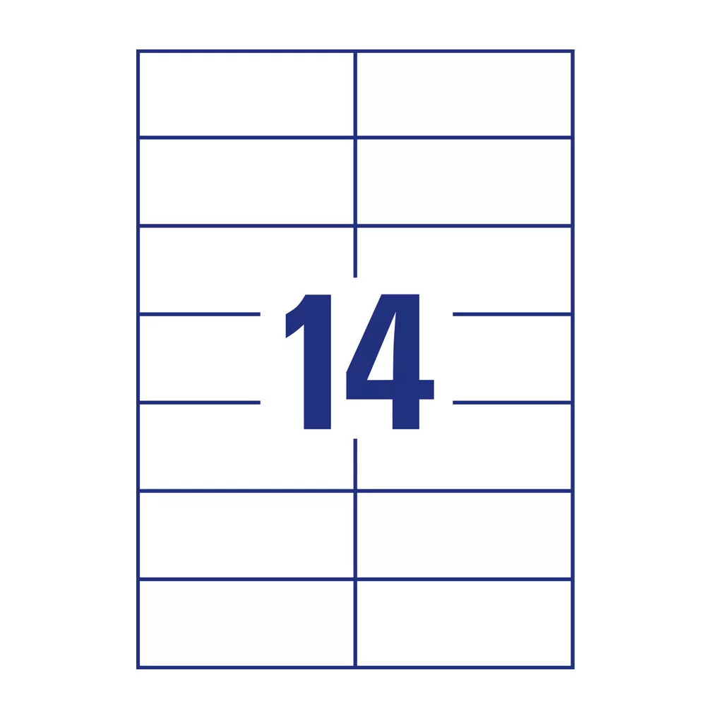 Címke mérete: 105 x 42,3 mm Doboz tartalma: 1400 darab címke - 100 ív/doboz (14 címke/lap) Tökéletesen alkalmasak például dobozok tartalmának feltüntetésére, készletinformáció és egyéb célból. Biztos lehet az elakadásmentes nyomtatásban, hiszen ragasztómaradvány nem kerül a nyomtatóba. Extra erős tapadás: a címkék meggyőző erővel tapadnak papírra, kartonra, üvegre és műanyagra egyaránt. Tökéletes pl. borítékokra, csomagokra, iratrendezőkre vagy fóliákra. Az univerzális etikettek minden igényt kielégítőek, tűéles képeket, kiváló toner tapadást és elkenődésmentes felületet biztosítanak. Környezetbarát, FSC® minősítésű és klórmentes eljárással fehérített. Tervezze meg és nyomtassa ki címkéit gyorsan és egyszerűen - ingyenes szoftverünkért és sablonjainkért látogasson el a http://www.avery.hu/templates-software/ weboldalra vagy használja a Microsoft® Office csomagokba beépített sablonjainkat! Optimalizált minőség tintasugaras, lézer és színes lézer nyomtatókhoz, fénymásolókhoz. Katalóguskód: 25263