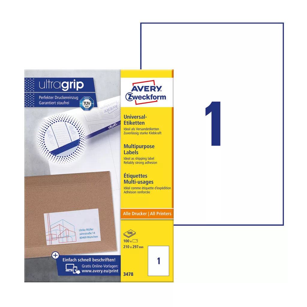 Címke mérete: 210 x 297 mm Doboz tartalma: 100 darab címke - 100 ív/doboz (1 címke/ lap) Tökéletesen alkalmasak például mappák és iratrendezők előlapjának esztétikus felcímkézésére. Biztos lehet az elakadásmentes nyomtatásban, hiszen ragasztómaradvány nem kerül a nyomtatóba. Extra erős tapadás: a címkék meggyőző erővel tapadnak papírra, kartonra, üvegre és műanyagra egyaránt. Tökéletes pl. borítékokra, csomagokra, iratrendezőkre vagy fóliákra. Az univerzális etikettek minden igényt kielégítőek, tűéles képeket, kiváló toner tapadást és elkenődésmentes felületet biztosítanak. Környezetbarát, FSC® minősítésű és klórmentes eljárással fehérített. Tervezze meg és nyomtassa ki címkéit gyorsan és egyszerűen - ingyenes szoftverünkért és sablonjainkért látogasson el a http://www.avery.hu/templates-software/ weboldalra vagy használja a Microsoft® Office csomagokba beépített sablonjainkat! Optimalizált minőség tintasugaras, lézer és színes lézer nyomtatókhoz, fénymásolókhoz. Katalóguskód: 25269