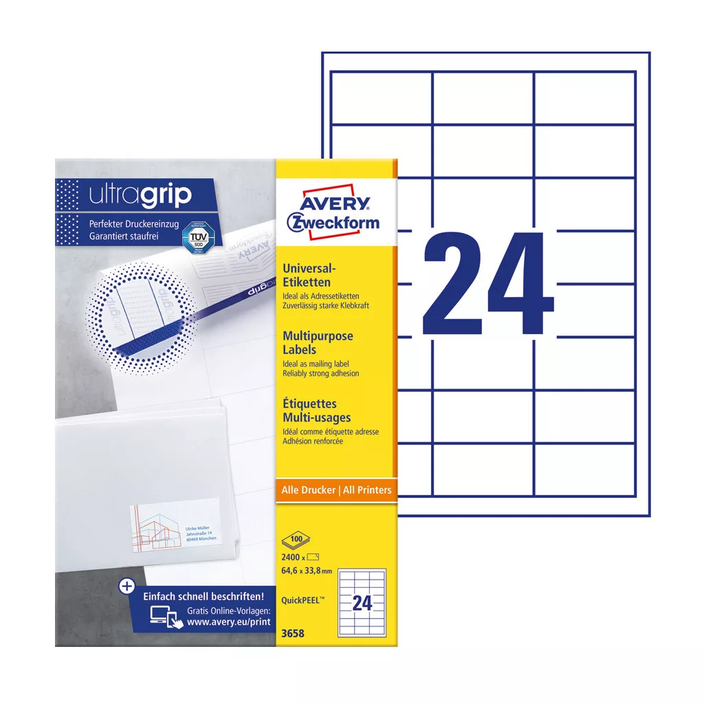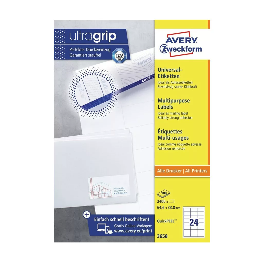 Címke mérete: 64,6 x 33,8 mmDoboz tartalma: 2400 darab címke - 100 ív/doboz (24 címke/ lap) Tökéletesen alkalmasak például különböző tárgyak tulajdon megjelölésére. Biztos lehet az elakadásmentes nyomtatásban, hiszen ragasztómaradvány nem kerül a nyomtatóba. Extra erős tapadás: a címkék meggyőző erővel tapadnak papírra, kartonra, üvegre és műanyagra egyaránt. Tökéletes pl. borítékokra, csomagokra, iratrendezőkre vagy fóliákra. Az univerzális etikettek minden igényt kielégítőek, tűéles képeket, kiváló toner tapadást és elkenődésmentes felületet biztosítanak. Környezetbarát, FSC® minősítésű és klórmentes eljárással fehérített. Tervezze meg és nyomtassa ki címkéit gyorsan és egyszerűen - ingyenes szoftverünkért és sablonjainkért látogasson el a http://www.avery.hu/templates-software/ weboldalra vagy használja a Microsoft® Office csomagokba beépített sablonjainkat! Optimalizált minőség tintasugaras, lézer és színes lézer nyomtatókhoz, fénymásolókhoz. Katalóguskód: 25252