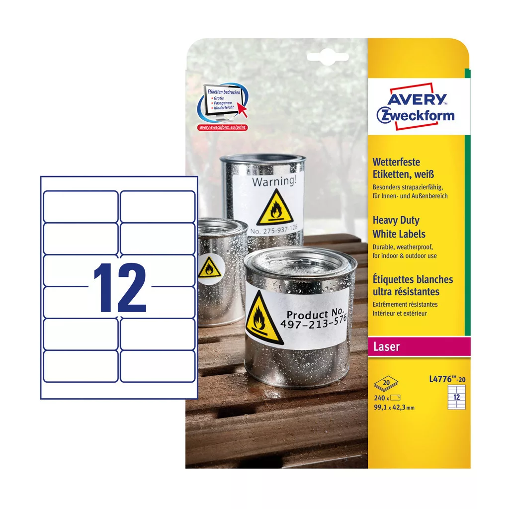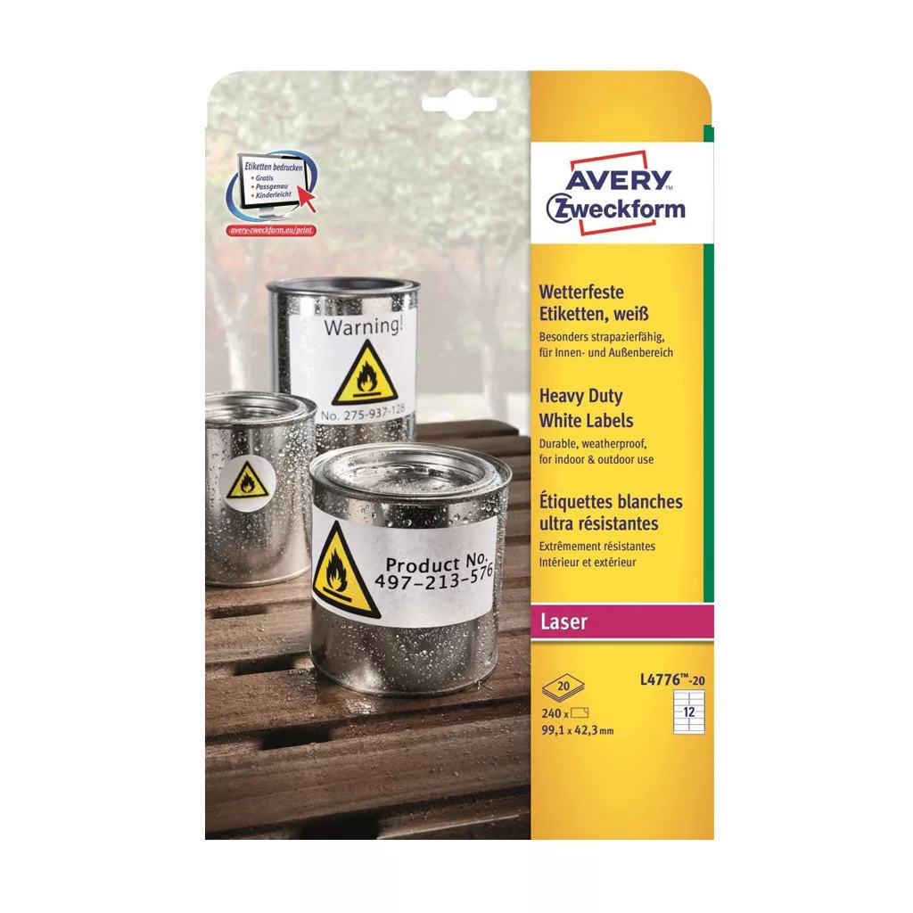Címke mérete: 99,1 x 42,3 mm Doboz tartalma: 240 darab címke - 20 ív/doboz (12 címke/ lap) Strapabíró poliészter időjárásálló címkéi lézernyomtatókhoz, kifejezetten kültéri használatra készültek. Az erős, tartós tapadású ragasztónak köszönhetően tökéletesen időjárásálló, megbízható és tartós. A strapabíró, poliészter filmből készült etikettek olaj, szennyeződés-, UV- és hőállóak (-20°C és +80°C között), vízállóak és szakadásbiztosak. Jóval erősebbek, mint a hagyományos papír etikettek. Tervezze meg és nyomtassa ki időjárásálló címkéit gyorsan és egyszerűen - ingyenes szoftverünkért és sablonjainkért látogasson el a http://www.avery.hu/templates-software/ weboldalra vagy használja a Microsoft® Office csomagokba beépített sablonjainkat! Kifejezetten lézer- és színes lézernyomtatókhoz fejlesztve.Katalóguskód: 25329