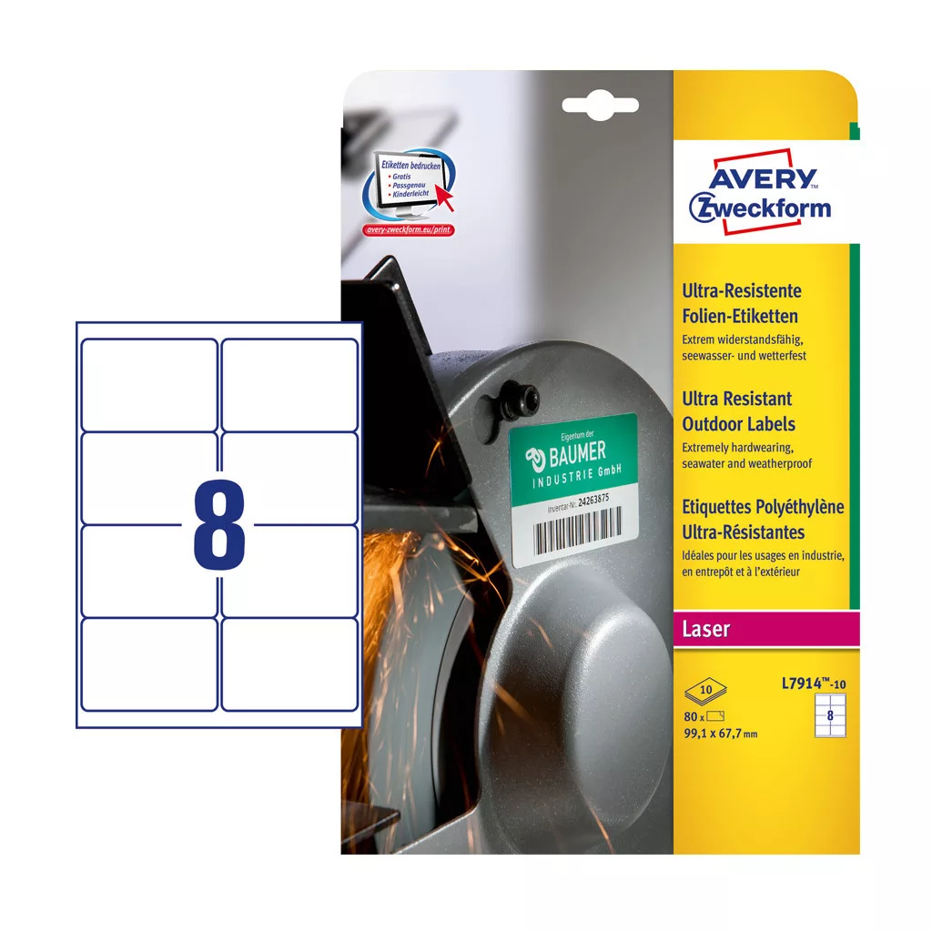 Címke mérete: 99,1 x 67,7 mmDoboz tartalma: 80 címke címke - 10ív/doboz (8 címke/ lap) Ultra ellenálló film címkéit, kiemelkedően nagy strapabíróság jellemzi, hogy megfeleljen a legmagasabb követelményeknek bel- és kültéren egyaránt. Felületkezelt, matt, rugalmas polietilén címke. Az erős, tartós tapadású ragasztónak köszönhetően, akár durvább felületeken tökéletesen tapad, különösen jól használható a termelésben, raktározásban, tárolóedények, szerszámok, gépek felcímkézésére vagy megjelölésére. A sós tengervíznek is ellenálló film etikett rendkívül strapabíró, időjárásálló, olaj-, szennyeződés-, UV- és hőálló (-40°C és +150°C között). Mindemellett az etikettek lemoshatóak, ellenállnak a legtöbb oldó- és tisztítószernek. Tervezze meg és nyomtassa ki címkéit gyorsan és egyszerűen - ingyenes szoftverünkért és sablonjainkért látogasson el a http://www.avery.hu/templates-software/ weboldalra vagy használja a Microsoft® Office csomagokba beépített sablonjainkat! Kifejezetten lézernyomtatókhoz fejlesztve.Katalóguskód: 25348