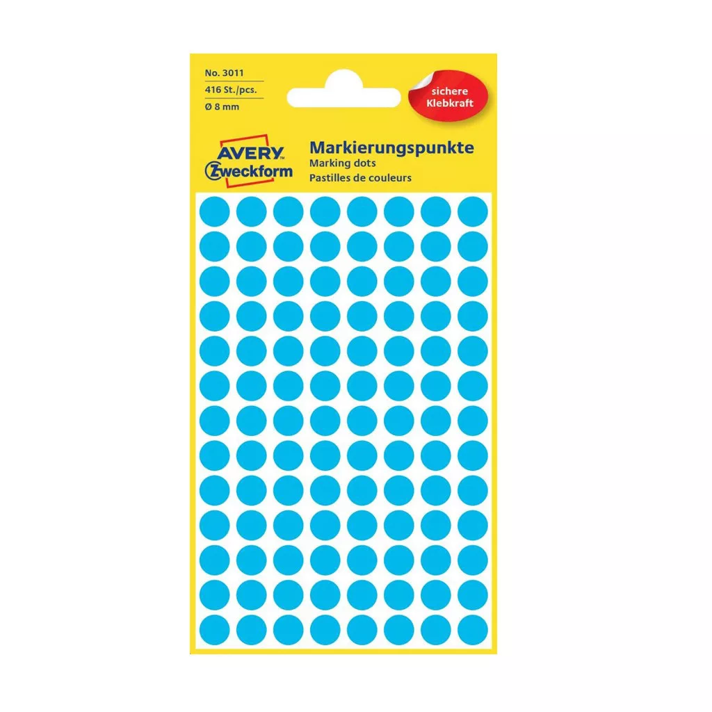 Címke mérete: 8 mm Csomag tartalma: 416 jelölőpont/csomag Az AVERY ZWECKFORM jelölőpontok tökéletesek jelölésre, rendszerezésre, tervezésre, iratrendezésre. Katalóguskód: 25361