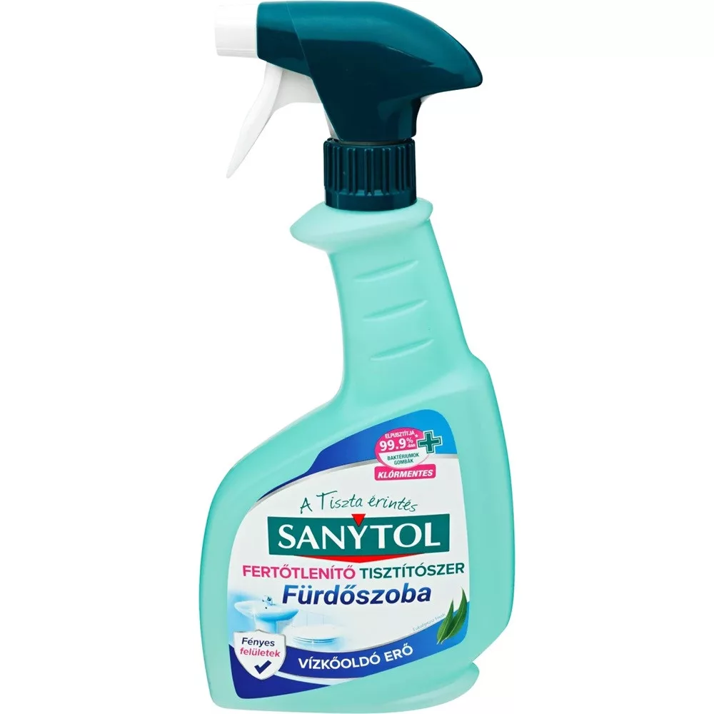 A Sanytol Fertőtlenítő felülettisztító spray fürdőszobai használatra lett kifejlesztve, extra erős tisztító hatásának köszönhetően tökéletes higiéniát biztosít. Megakadályozza a penész-, és vízkőképződést. A klórmentes, eukaliptusz illatú Sanytol fertőtlenítő fürdőszobai tisztítószer 99,9%-ban elpusztítja a mikroorganizmusokat. Hármas hatásának köszönhetően, gombák, baktériumok, és vírusok ellen is hatékony. Aktericid (5 perc alatt) hatás az alábbiak ellen: Staphylococcus aureus, Enterococcus hirae, Escherichia coli, Pseudomonas aeruginosa; gombaölő (15 perc alatt) hatás az alábbiak ellen: Candidad albicans, Aspergilus niger az EN13697 szabvány szerint. Az EN14476 szabvány szerint elpusztítja az Influenza A H1N1 vírus (5 perc alatt) és a Herpes Simplex vírus (5 perc alatt). A termék hatékonyságát hitelesített laboratóriumi vizsgálatok igazolják.