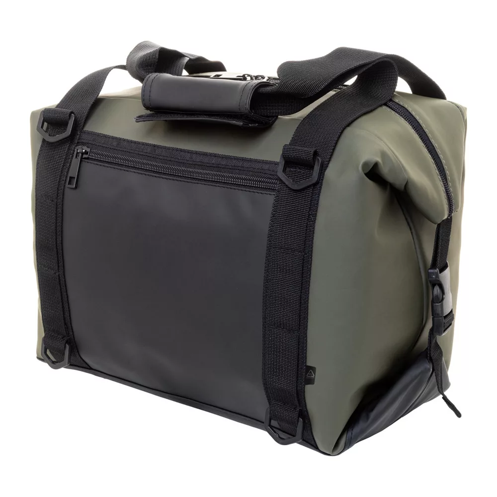 Cipzáras, összecsukható hűtőtáska puha újrahasznosított PU bőrből, alumínium béléssel és cipzáras első zsebbel. Oldalsó csatokkal, fogantyúkkal és állítható vállpánttal. A táska laposra hajtható a könnyebb tárolás érdekében, vagy használat közben az oldalsó csatokkal rögzíthető.
