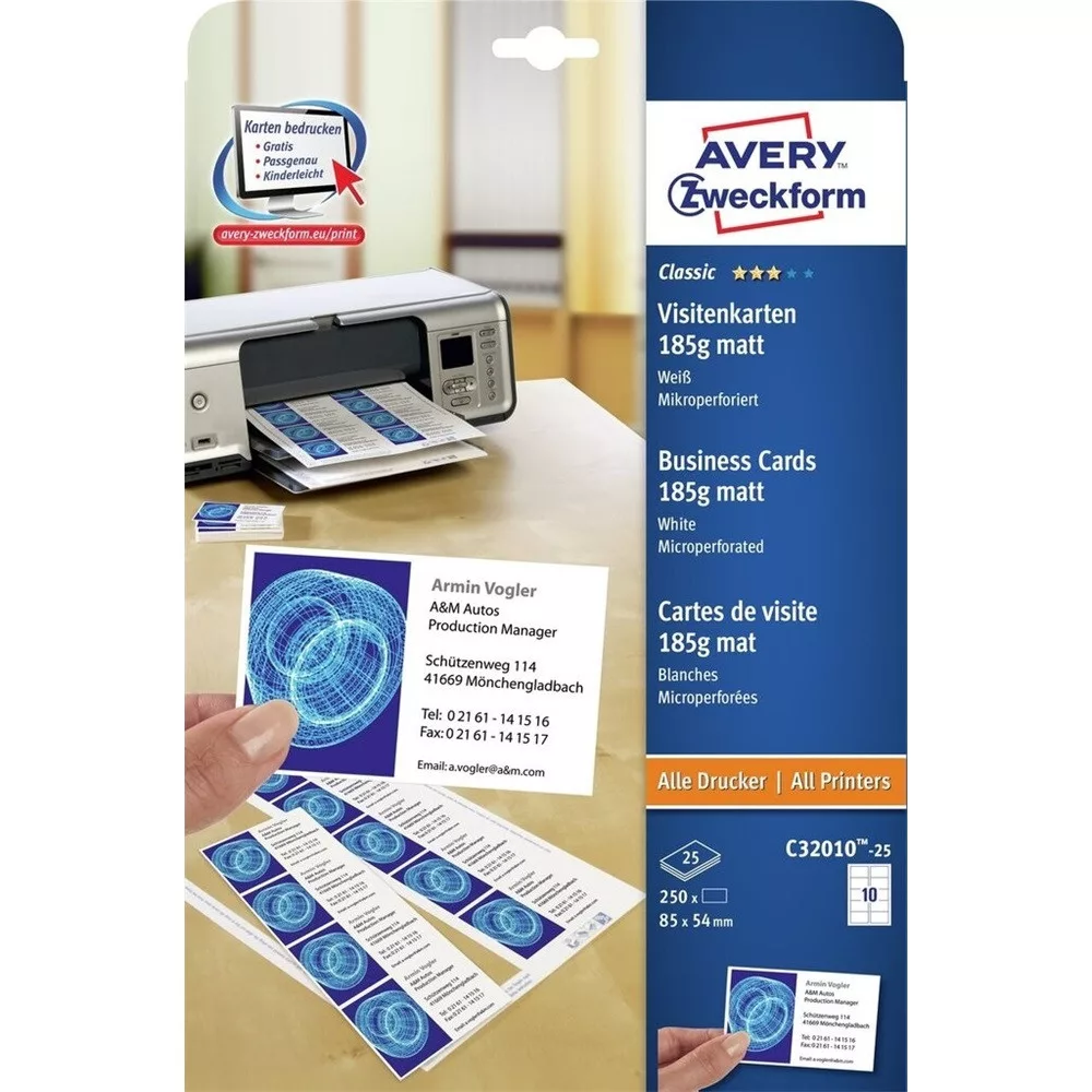 Névjegykártya mérete: 85 x 54 mm Csomag tartalma: 25 ív/doboz 250 darab névjegykártya Klasszikus névjegykártyái kiváló nyomtatási minőséget garantálnak minden szabványos nyomtatón. A matt, mindkét oldalán nyomtatható 185 g/m2 névjegykártya mikroperforációval ellátott. Környezetbarát, FSC® minősített és Klórmentes eljárással fehérített. Tervezze meg és nyomtassa ki saját névjegykártyáját könnyen és gyorsan - ingyenes kártyasablonokért és az Avery® Design&Print online szoftverért látogasson el a www.avery.hu/templates-software/ weboldalra. Minden ismert hagyományos nyomtatóval nyomtatható.Katalóguskód: 25418