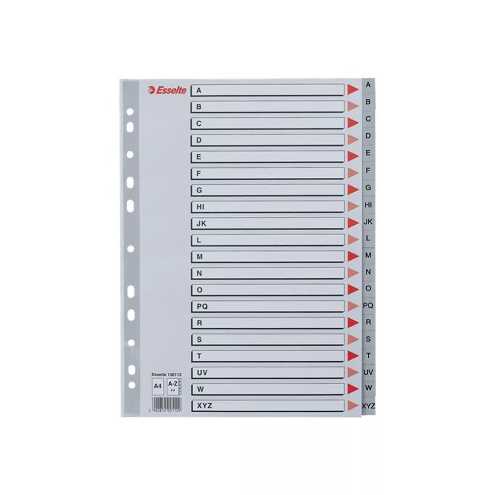 Szürke színű regiszter. Nagyméretű téglalapok az előlapon a tartalom feltüntetésére. Megerősített lefűzőrész az előlapon A-Z felirattal rendelkező regiszter fülek a dokumentumok gyors eléréséhez Hagyományos, 11-lyukú lefűzőrész A4 méret 0,12 mm vastag PP alapanyag Katalóguskód: 35876