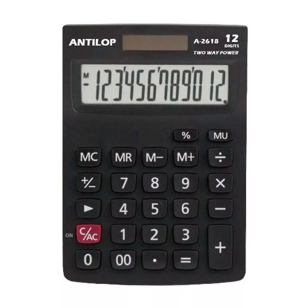 Antilop A2618 fekete asztali számológép 12 számjegyű nagy kijelző, memória funkció, százalékszámítás, haszonrés számítás, 00, előjel váltás, vissza léptetés és alapműveletek. Működési mód: napelem+elem. Méret: 140 x 100 x 28 mm. 100db/karton Katalóguskód: 1708