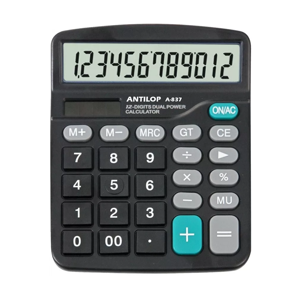 Antilop A837 fekete asztali számológép 12 számjegyű nagy kijelző, memória funkció, százalékszámítás, gyökvonás, előjel váltás, GT funkció, vissza léptetés és alapműveletek. Működési mód: ceruzaelem+napelem. Méret: 145 x 120 x 40 mm. Katalóguskód: 1736