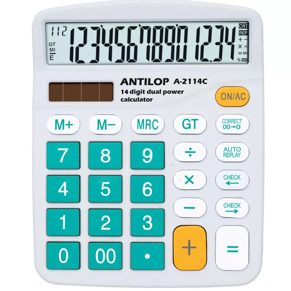 Antilop A-2114C színes asztali számológép 14 számjegyű nagy kijelző, memória funkció, GT, műveletek közötti előre és vissza léptetés, auto replay, 00 javítás 0-ra, és alapműveletek.Működési mód: ceruzaelem+napelem. Méret: 145 x 120 x 40 mm. Katalóguskód: 1705