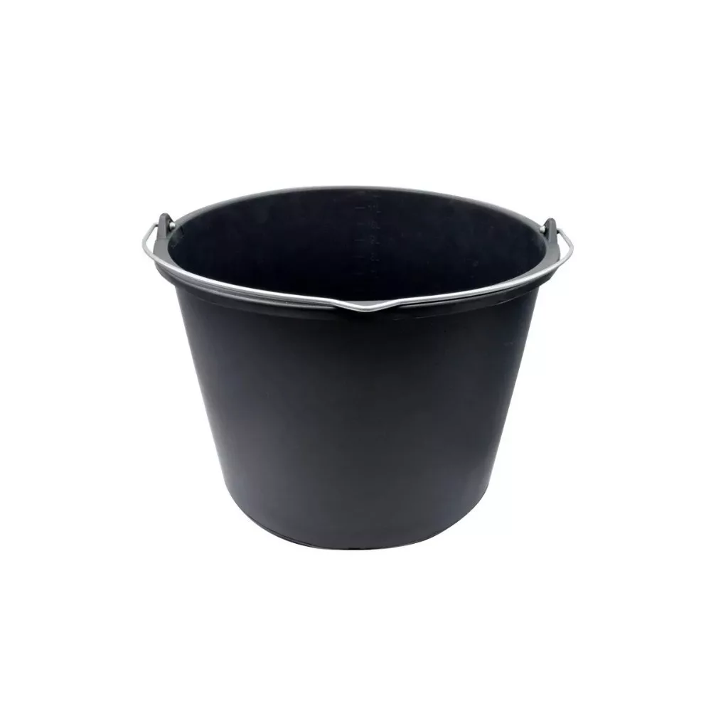 Vastag műanyagból készült csőrös, 16 L-es vödör, fém fogantyúval. Erősített építési vödör.