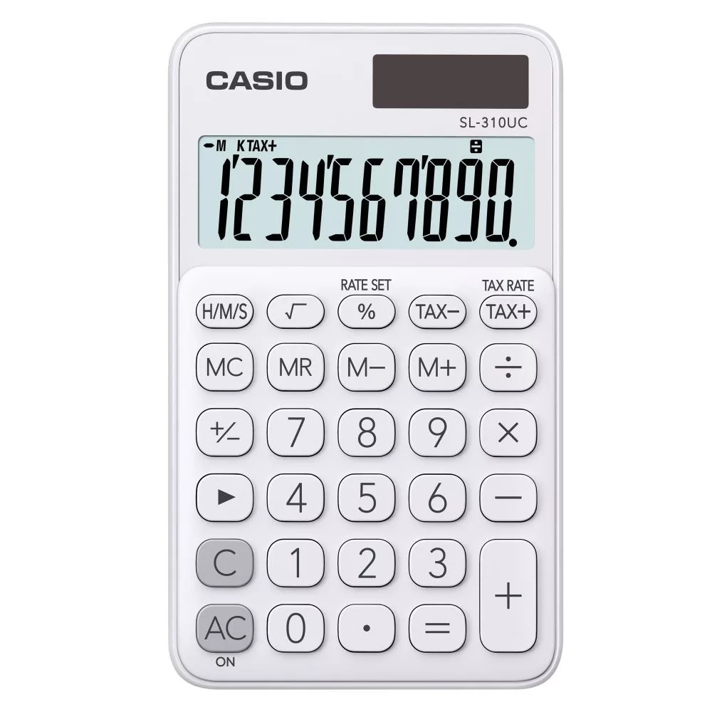10 számjegyű, NAGY KIJELZŐ, "trendy colours" sorozat, elem+napelem, %, árrés számítás, idővel kapcsolatos számítások, ÁFA számítás, memória, +/-, utolsó számjegy javítása, gyökvonás, FEHÉR Katalóguskód: 42555